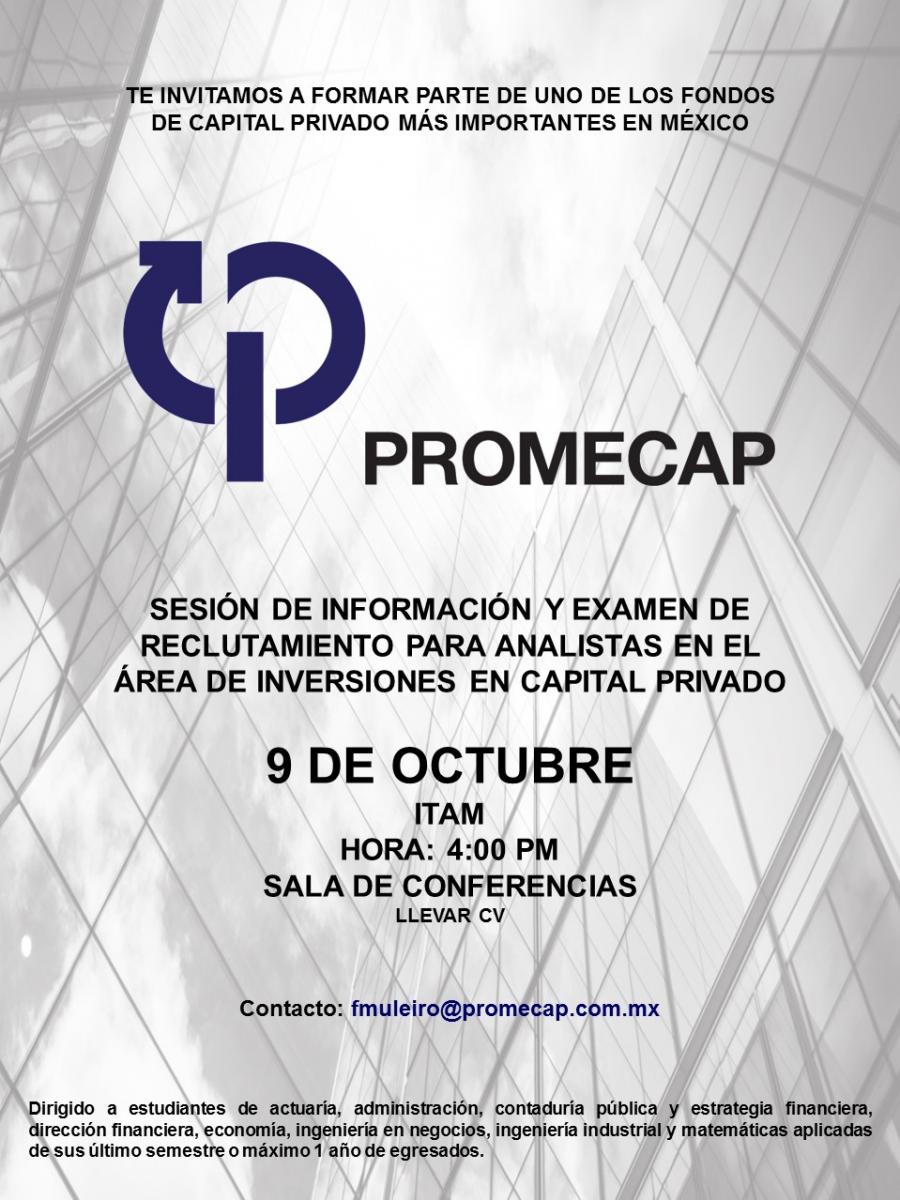 Promecap, en conjunto con la Bolsa de Trabajo, invita a su presentación y aplicación de examen, dirigido a alumnos de Actuaría, Administración, Contaduría Pública y Estrategia Financiera, Dirección Financiera, Economía, Matemáticas Aplicadas, así como Ingenierías Industrial y Negocios de últimos dos semestres y egresados con menos de dos años de experiencia.