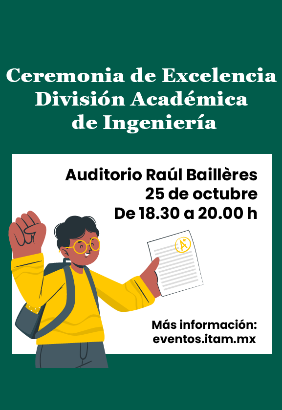 En la División Académica de Ingeniería otorgamos públicamente un reconocimiento a todos los alumnos que se hayan destacado académicamente, con el afán de fomentar y premiar la excelencia académica entre los estudiantes. La ceremonia se llevará a cabo el próximo martes 25 de octubre, a las 18:30 hrs., en el Auditorio Raúl Bailléres.