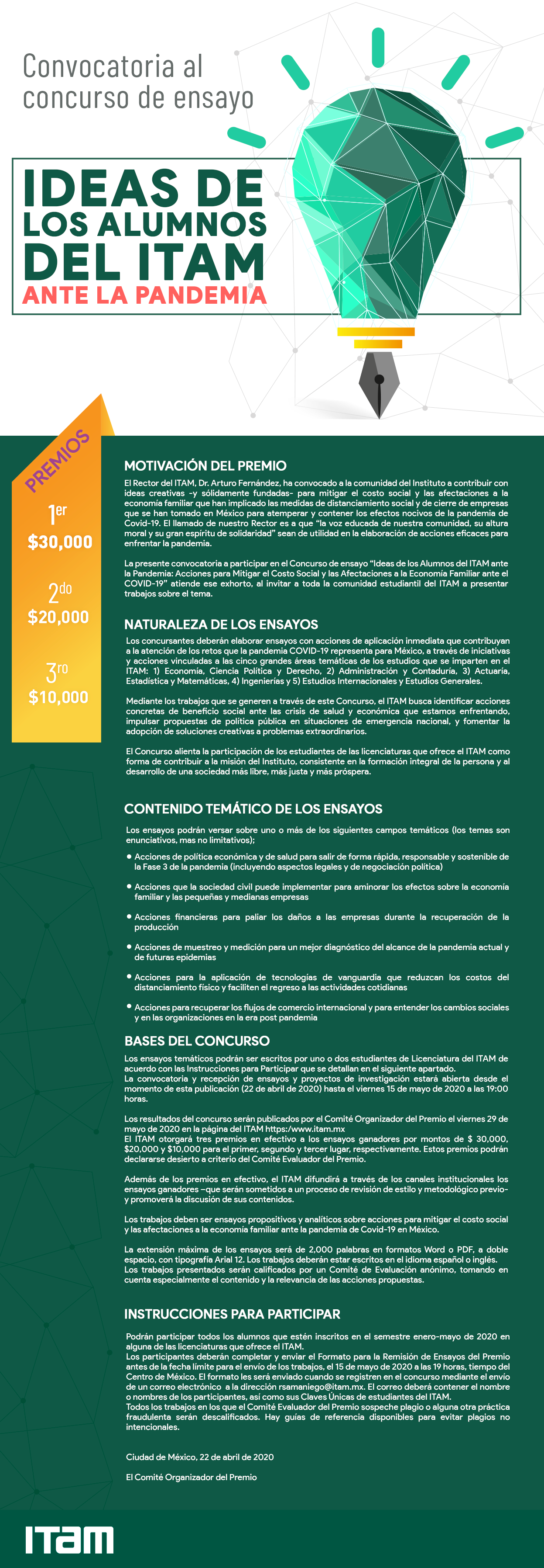 La presente convocatoria a participar en el Concurso de ensayo “Ideas de los Alumnos del ITAM ante la Pandemia: Acciones para Mitigar el Costo Social y las Afectaciones a la Economía Familiar ante el COVID-19” atiende ese exhorto, al invitar a toda la comunidad estudiantil del ITAM a presentar trabajos sobre el tema.